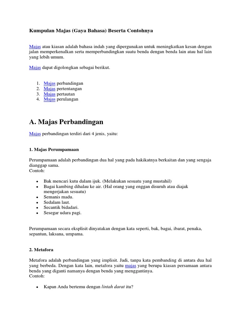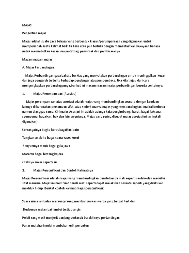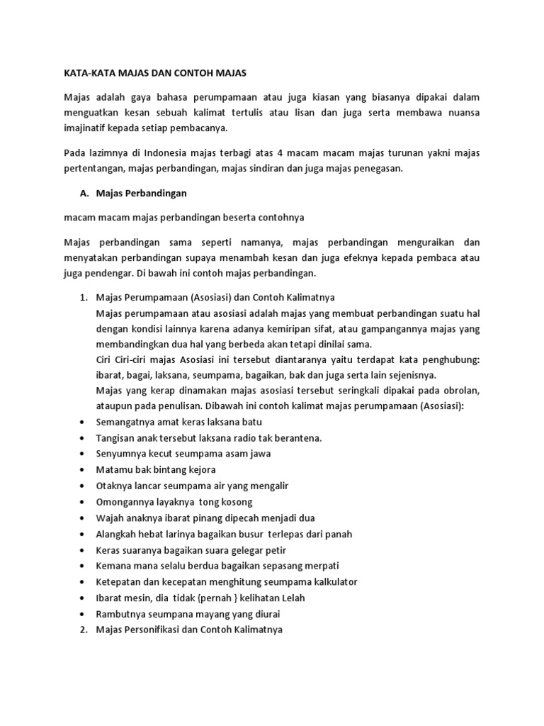 Berikut beberapa contoh majas perumpamaan dalam kalimat beserta penjelasannya! Berikut ini contoh kalimat majas seperti personifikasi, metafora, hiperbola, sinekdoke, ironi, sinisme, klimaks, anti klimaks, dan lain lainnya. Majas asosiasi atau majas perumpamaan merupakan sebuah ungkapan dengan gaya bahasa yang menjelaskan suatu makna dalam kalimat dengan cara membandingkan objek yang memiliki persamaan sifat walaupun objek berikut ini contoh majas asosiasi berdasarkan ungkapan kalimat Berikut contoh kalimat majas simile. Majas personifikasi dan contoh kalimatnya.